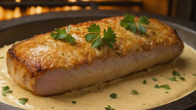 • Mit Soße aus Bratensaft, Senf und Sahne im Ofen garen, abgedeckt für Saftigkeit.